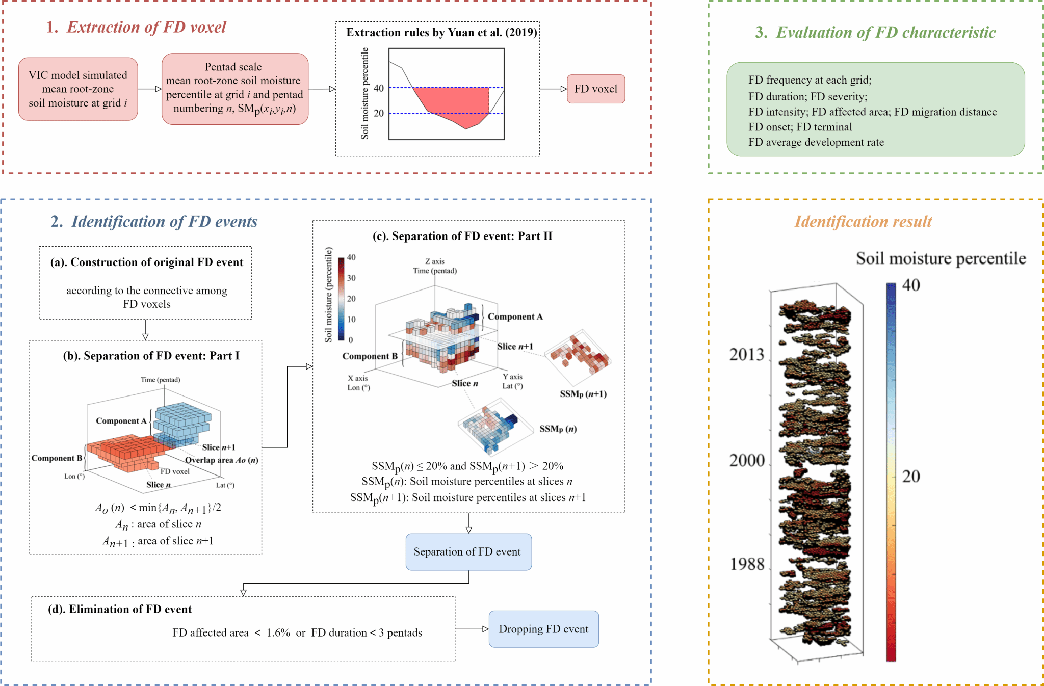 该研究创新性地拓展了李佳韵博士自主研发并获国家发明专利的骤旱三维识别模型(V3DFD, Voxel-based Three-Dimensional Flash Drought Identification),首次将该模型应用于中国干旱区、半湿润区和湿润区的骤旱三维演化过程解析。研究表明V3DFD方法能有效捕捉骤旱完整迁移发展轨迹,并揭示了不同气候区骤旱的演化特征和差异化形成机制:湿润区骤旱迁移距离长范围大,干旱区骤旱频次高强度弱,降水亏缺为共同诱因,但干旱区骤旱受大风蒸发主导,湿润区由高温低湿驱动。