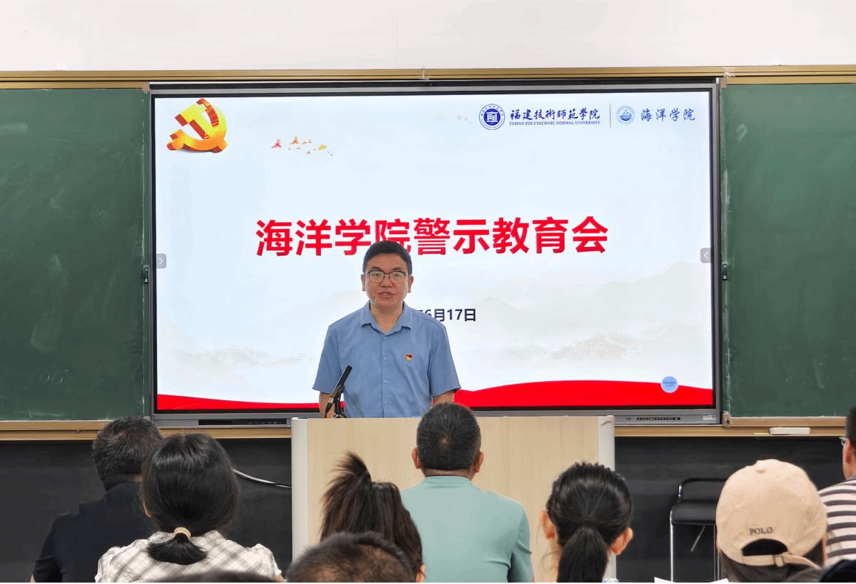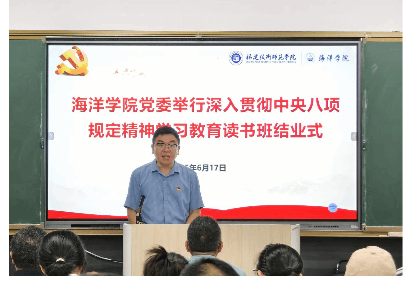 为深入贯彻中央八项规定精神学习教育,进一步严明纪律规矩、强化警示教育。2025年6月17日,海洋学院党委召开警示教育会暨深入贯彻中央八项规定精神学习教育读书班结业式,学院党委书记陈素文主持会议并讲话,学院师生党员参加会议。