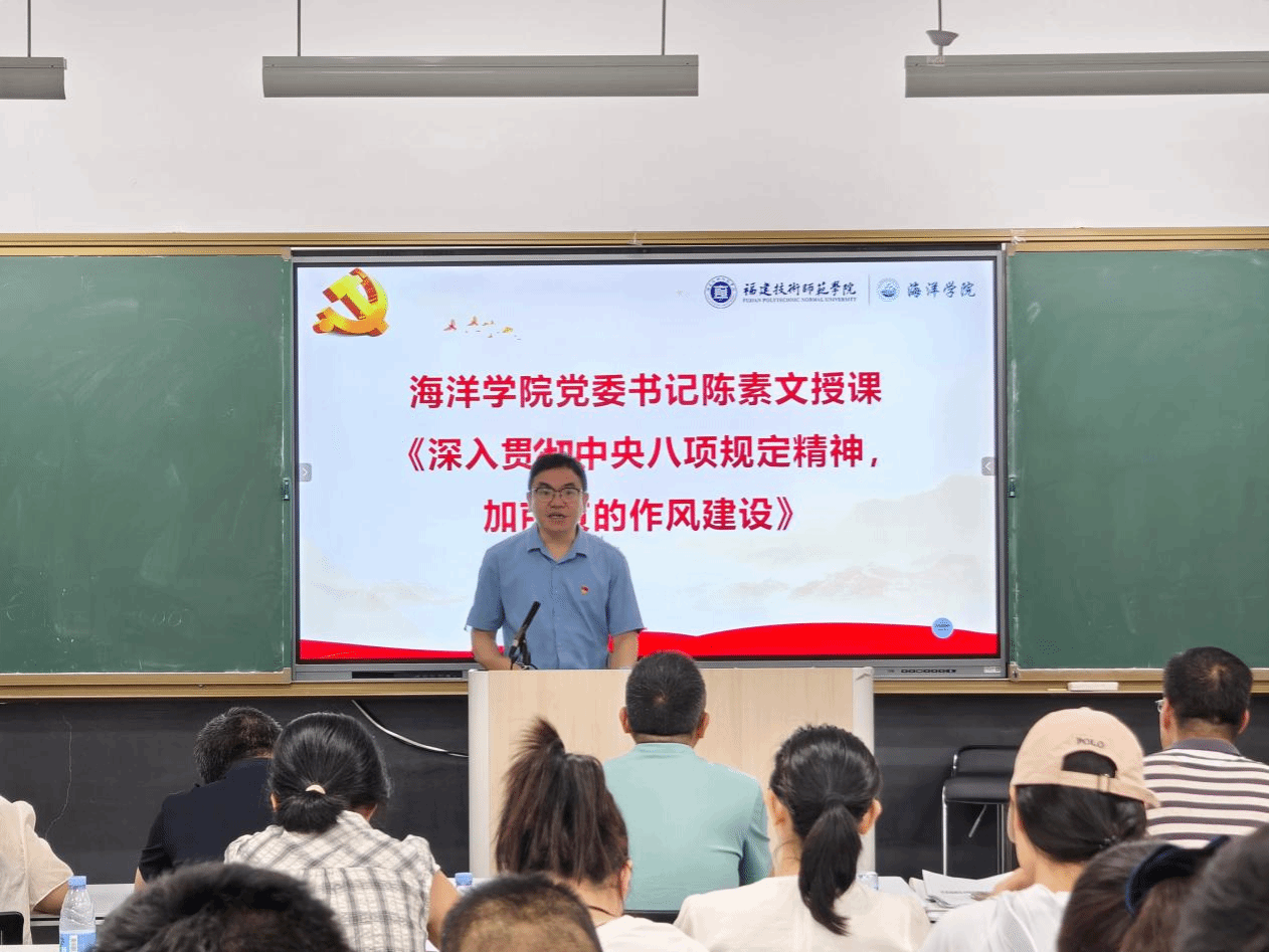 会上,海洋学院党委书记陈素文讲授《深入贯彻中央八项规定精神,加强党的作风建设》专题党课,重点介绍党的十八大以来深入贯彻中央八项规定精神的成效和经验,会议通报了违反中央八项规定及其实施细则精神典型案例,针对“不担当不作为”“违规吃喝”等案例开展警示教育,深入剖析“四风”问题在教育领域的具体表现,要求师生党员对照标准查摆问题,以自我革命精神筑牢廉洁防线。