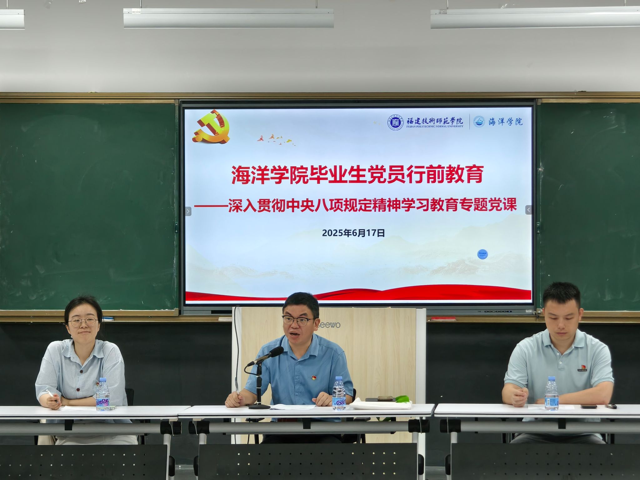 海洋学院党委书记陈素文以《筑牢廉洁防线,启航奋斗新程》为题授课,结合中央八项规定精神,从“回顾成长历程”“强化党性修养”“筑牢廉洁防线”“践行廉洁承诺”四个方面,提醒毕业生党员须警惕社会环境中的利益诱惑,突出强调“慎独慎微”作为廉洁自律底线的重要价值。