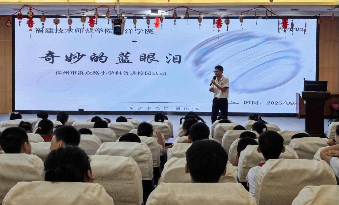 9月17日下午,海洋学院丁光茂高级工程师带领“蓝眼泪”团队走进福州市群众路小学,为百余名小学生带来了一场生动有趣的海洋知识科普讲座。