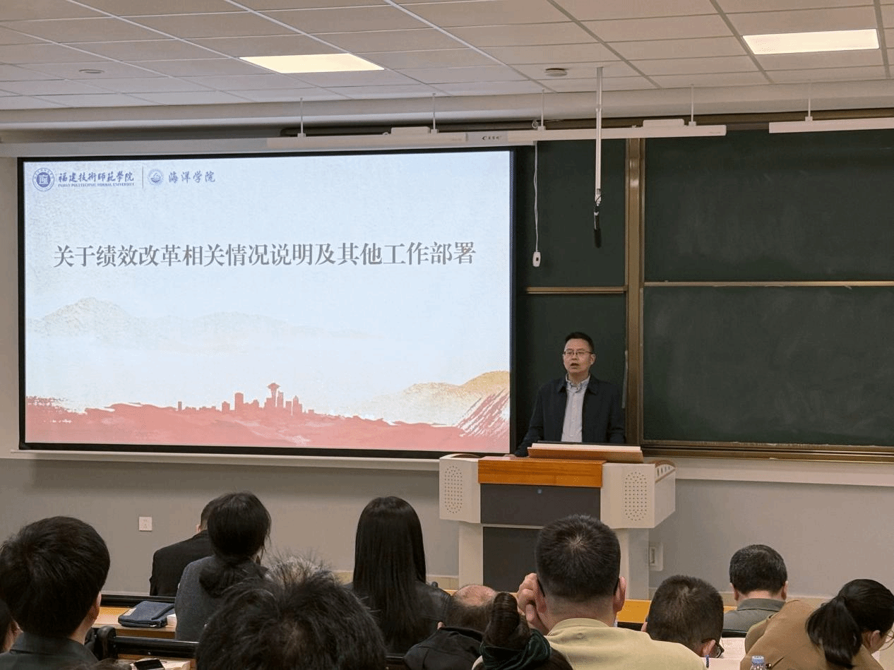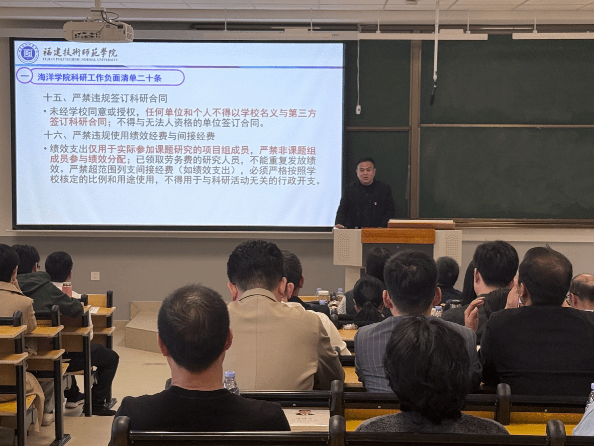学院纪委书记、副院长杨文卿对海洋学院科研工作负面清单“二十条”、学校相关科研工作规定进行深入细致解读,回顾总结我院创新创业教育工作成果,动员教师们踊跃参加重要学科竞赛,同时强调师德师风相关工作。