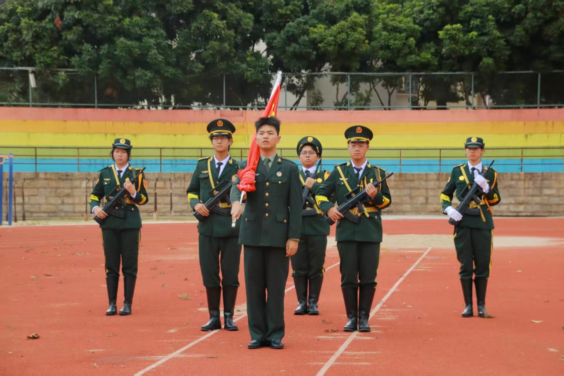 国旗护卫队迈着整齐有力的步伐护送国旗入场,在庄严的国歌中,五星红旗冉冉升起,迎风飘扬,全体师生行注目礼,齐唱国歌。