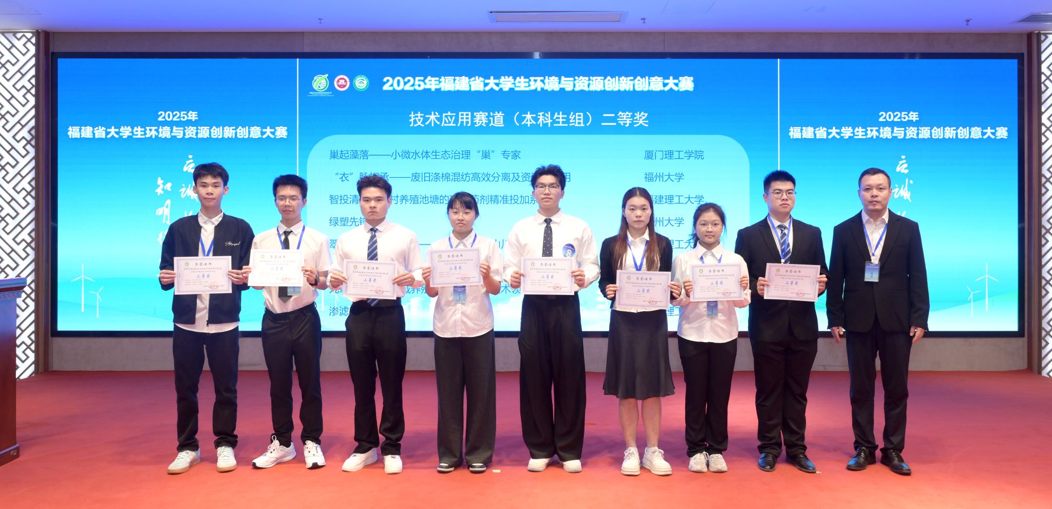 本届大赛采用环境与资源学术研究和环境与资源技术应用两种选题方式,经过激烈角逐,我院三支团队表现优异,获得二等奖一项、三等奖两项的佳绩!荣获二等奖项目“九章——近海流域养殖水渣集成处理技术领航者”,团队成员有2024级环境工程陈婧、2023级环境工程李语彤、2020级环境工程陈亮宇同学,指导老师为杨文卿、路则洋;获得三等奖项目“福怀农业—AI算法驱动种养循环新模式”,团队成员有2023级旅游管理于家乐、2023级环境工程林婉玲、2022级应用化学高文娣,指导老师为杨文卿、林代峰;获得三等奖项目“追踪骤旱的脚步—中国典型气候区骤发干旱时空动态演化特征探究”,团队成员有2023级环境工程刘彦凯、2023级环境工程李玥、2024级旅游管理李梦思怡同学,指导老师为李佳韵、刘维丽。