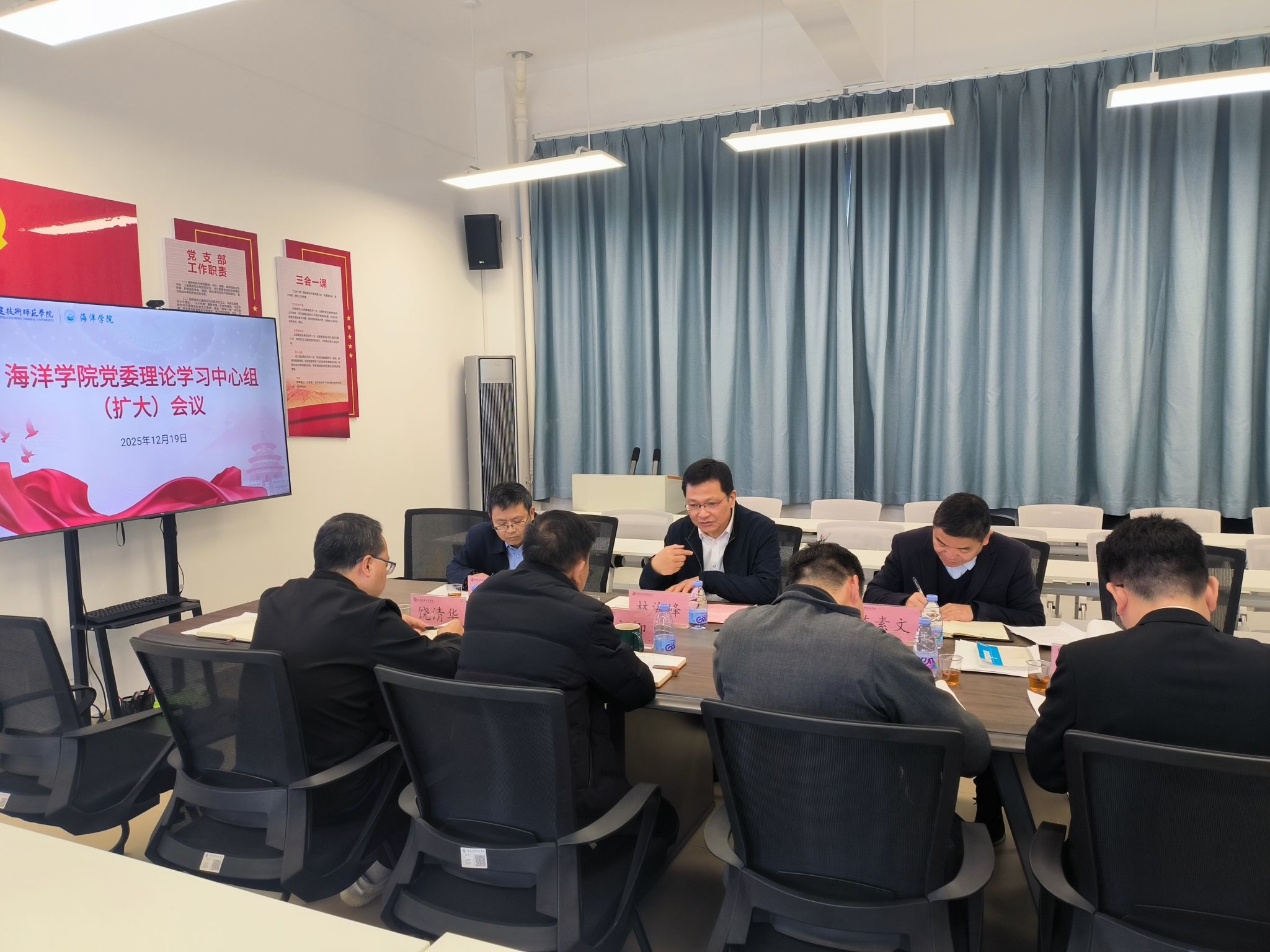 本次学习采取集中领学、重点发言相结合的方式,集中学习了党的二十届四中全会精神、《习近平谈治国理政》第五卷等相关内容。海洋学院党委书记陈素文围绕“准确把握‘十五五’时期在基本实现社会主义现代化进程中的重要地位”内容开展宣讲。在交流发言环节,与会人员结合学院发展与自身工作实际,聚焦全面从严治党、人才培养、学科建设、校园文化等方面开展研讨。