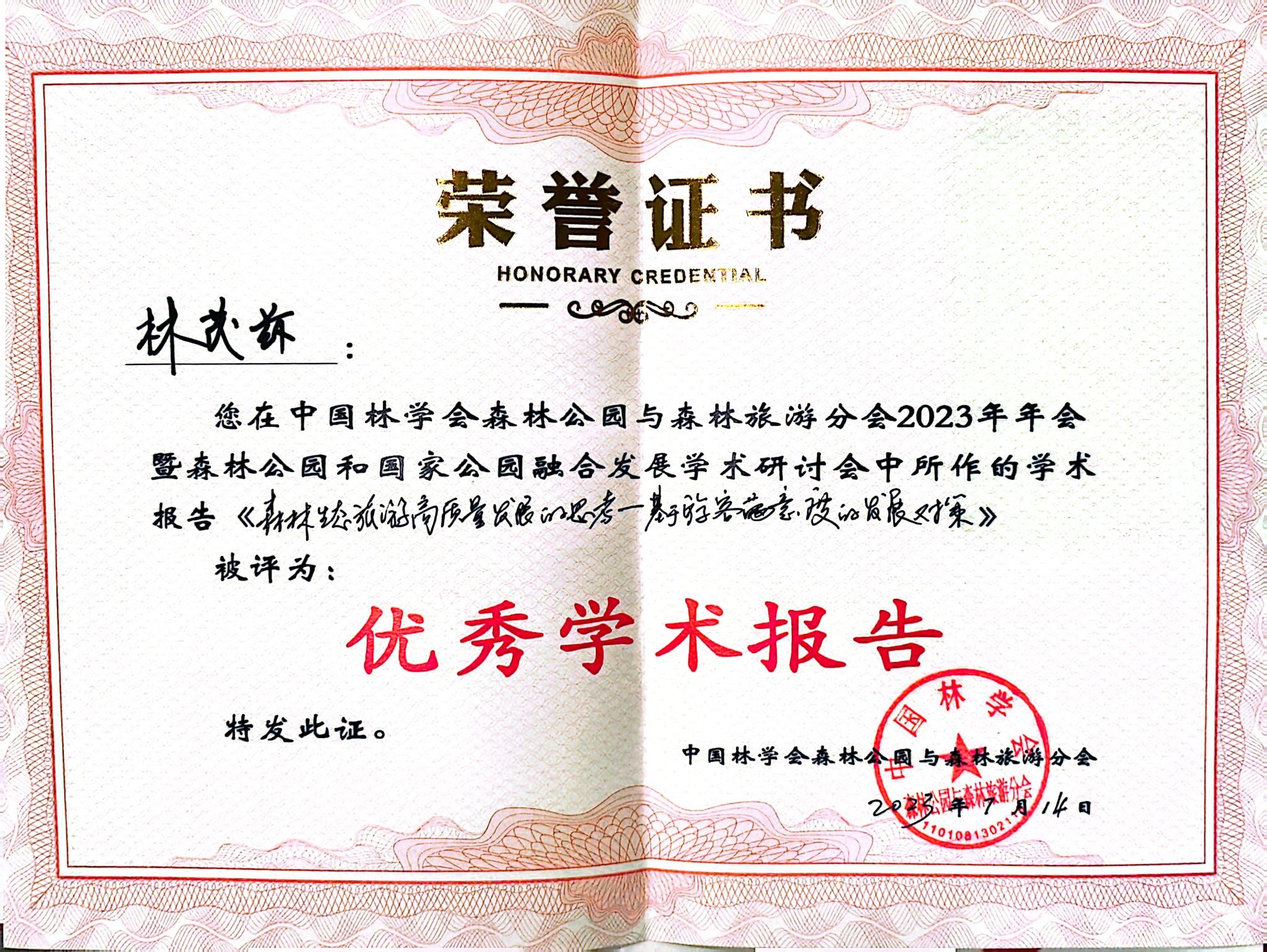 林茂兹教授领导的研究团队在会上作了题为《森林生态旅游高质量发展的思考——基于游客满意度的发展对策》专题报告,获得大会优秀学术报告奖。报告通过文献研究获得以全国82个森林旅游景区为研究对象的关于游客年龄段分布和游客感知满意度-重要性分析(IPA)数据,再针对牛姆林森林生态景区游客满意度进行实证研究,阐述我国森林生态旅游目的地发展需要明确森林生态旅游目标定位,加强森林生态旅游目的地管理,加强森林生态旅游地历史文化发掘和宣传、促进森林生态旅游发展。