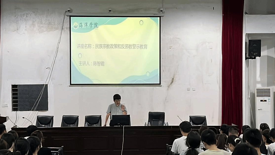 9月25日晚上,我院在向高报告厅(一)开展了民族宗教政策和反邪教警示教育讲座,全体2023级新生参加,讲座由辅导员陈智锟宣讲。
