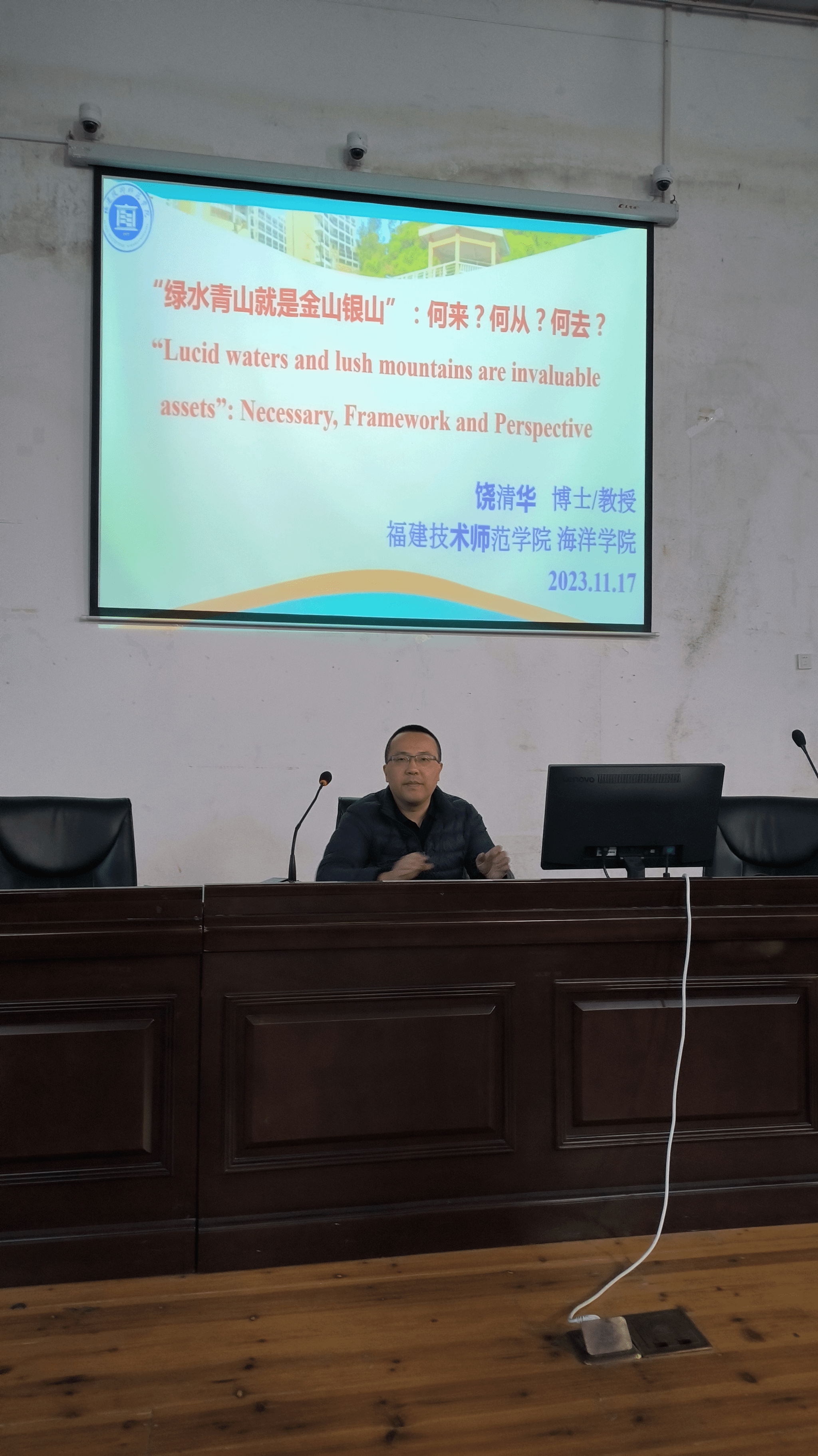 11月17日上午,我院饶清华教授在向高园报告厅(一)为学院师生开展题为《“绿水青山就是金山银山”:何来?何从?何去?》学术报告,我院海洋资源与环境、环境工程、旅游管理与服务教育三个专业师生近80人参加。
