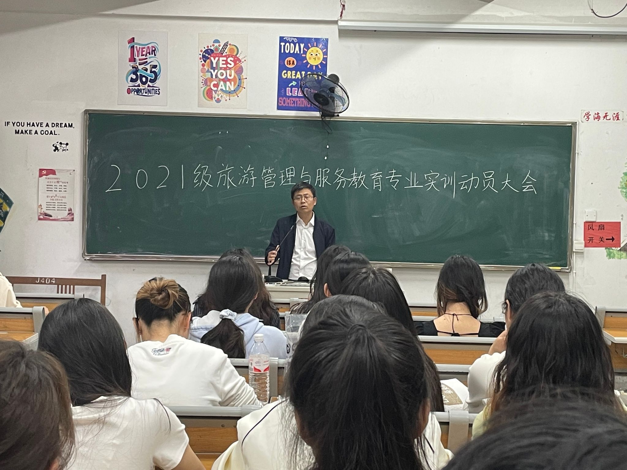 为做好实训工作,3月24日晚,我院2021级旅游管理与服务教育专业实训动员大会在教学楼102教室召开。学院副院长(主持工作)林茂兹、专业主任刘永涓、辅导员宫鹏及实训队全体同学参加。