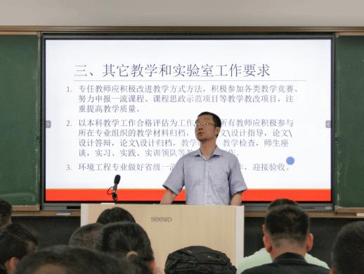 会上,学院副院长廖谋华副教授传达省教育厅关于做好秋季学期开学相关工作的文件精神,就维护正常的教学秩序、课堂教学坚持正确政治立场、实验教学严格遵守安全规范等日常教学工作提出明确要求。廖副院长指出,要积极改进教学方式方法,努力申报教学教改项目,注重提高教学质量;要做好环境工程专业省级一流本科专业建设任务验收工作;要紧紧围绕学校今年中心工作,以评促建、以评促改,迎接做好本科教学工作合格评估。