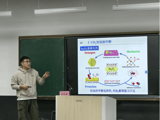 林代峰博士结合自身研究和领域前沿进展,从CO2排放与控制现状、CO2加氢制甲醇和Co-In2O3催化剂的应用等方面开展了深入的讲解。他还分享了未来研究方向,该项目得到福建省自然基金项目的支持。