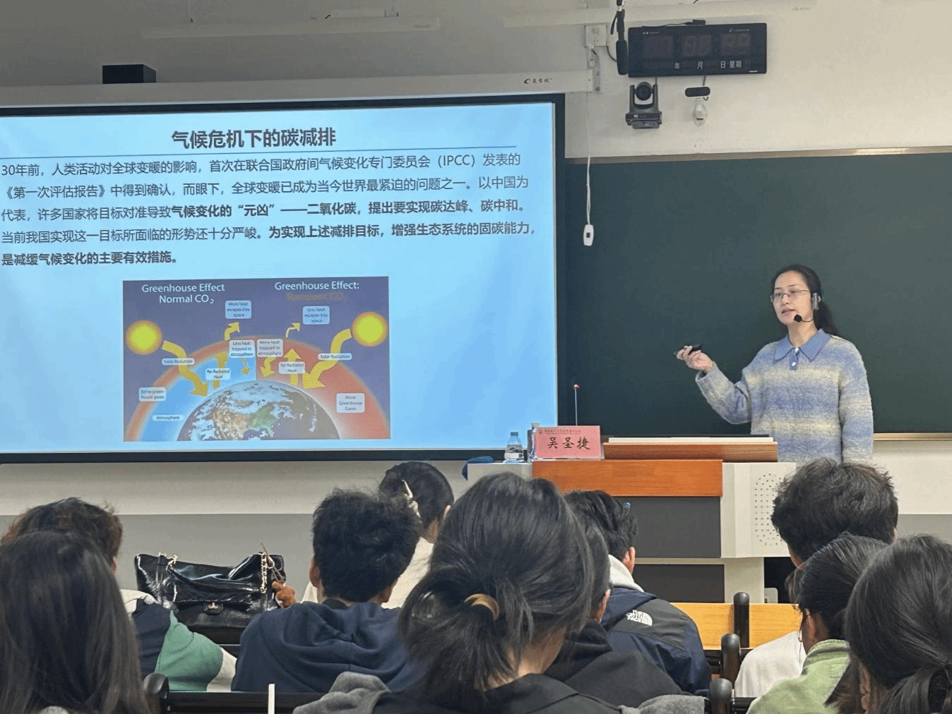 互动环节,师生围绕蓝碳监测技术创新、碳汇实践难点等问题深入探讨。吴博士结合自身经验,通过案例拆解、原理分析耐心答疑,现场学术氛围浓厚,思维碰撞不断。