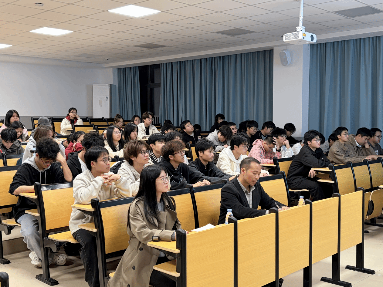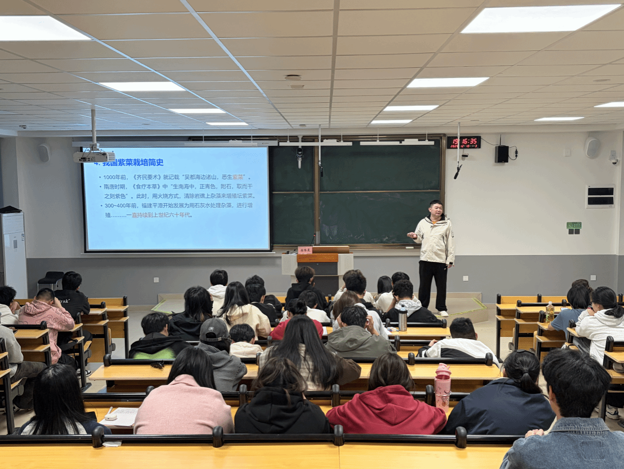 讲座核心环节,唐博士分享了海藻细胞工程育种领域的前沿科研成果。他介绍,依托该技术已成功培育出高产、抗逆、优质的紫菜新品种,有效破解了传统养殖中产量波动大、抗风险能力弱等行业痛点,为产业高质量发展注入新动能。同时,他结合自身多年科研实践,将抽象的育种原理转化为通俗易懂的实操经验,兼具专业性与实用性,让在场师生收获颇丰。