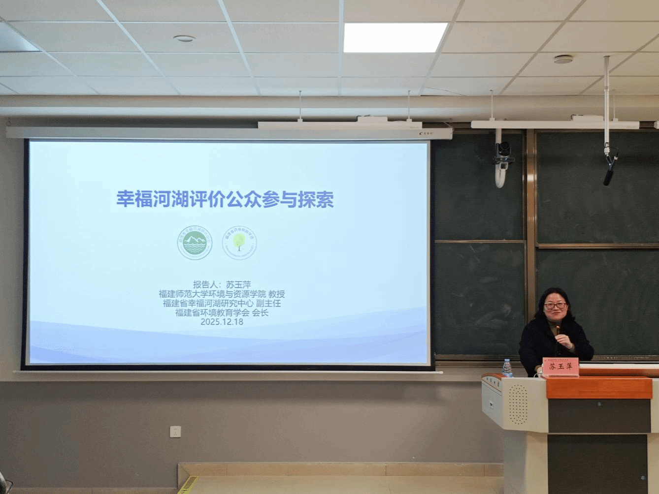 12月18日晚,福建师范大学环境工程与科学学院博士生导师苏玉萍教授受邀莅临我院,在笃行3号楼203教室带来题为《幸福河湖评价公众参与探索》的专题学术讲座。本次讲座由苏金洙博士主持,吸引了校内多个学院的近百名师生踊跃参与,现场学习氛围浓厚。