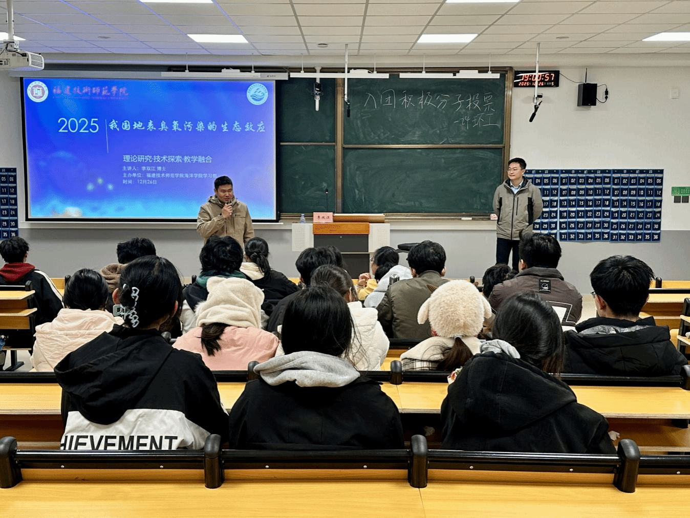 报告中,李博士还深入探讨了臭氧污染与植物源挥发性有机物(BVOCs)的复杂作用机制。他强调,高浓度臭氧会改变BVOCs的排放组成,而这种变化可能进一步加剧区域性臭氧生成,形成恶性循环的反馈链条,为臭氧污染防治提供了重要研究视角。报告尾声,李老师结合福建省森林覆盖率高、BVOCs排放活跃的地域特色,引导同学们立足本地实际,积极探索臭氧污染防治的创新路径,激发了大家的科研热情与实践思考。