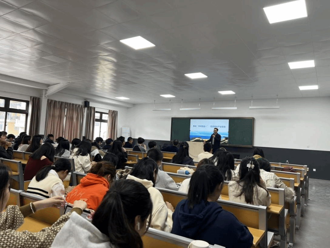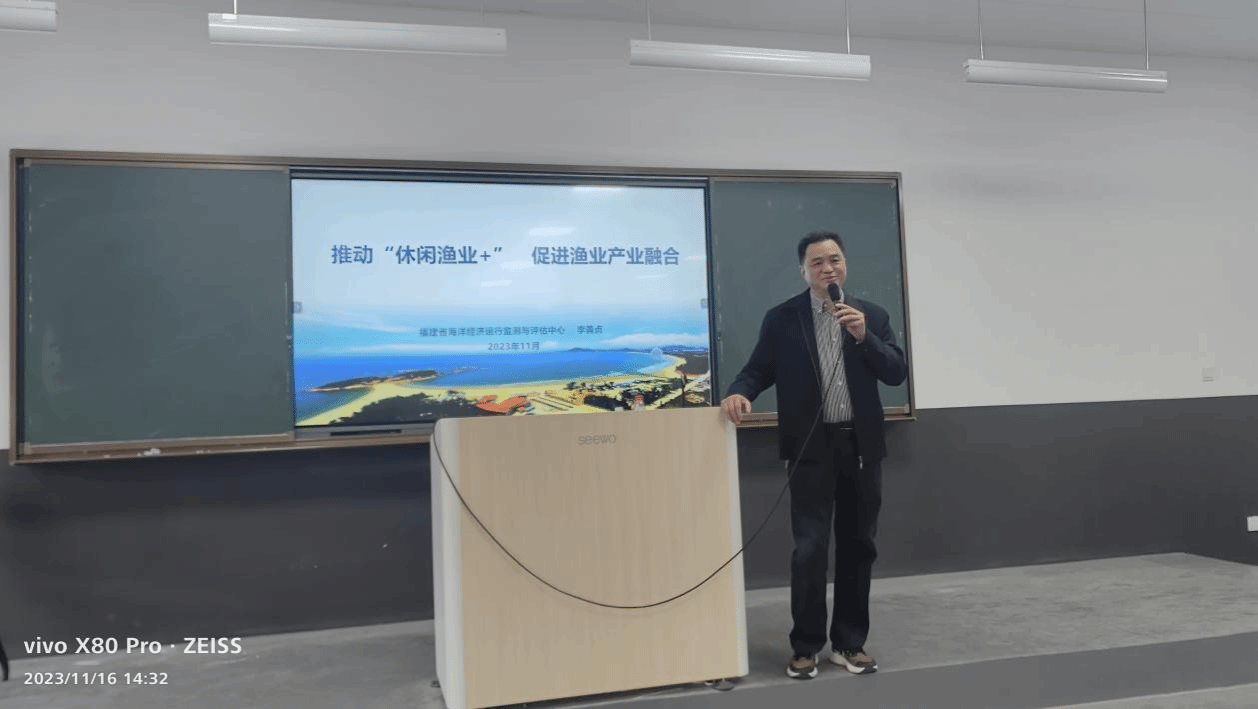 报告会上,李善贞主任介绍了休闲渔业基本定义、福建省休闲渔业基本情况和主要做法、休闲渔业发展存在问题和未来方向。他分析了我省休闲渔业发展的基本态势,提出了休闲渔业要以水乡渔村、海钓基地、沿海众多渔港、挖掘渔业文化内涵等方面为依托,培育休闲渔业发展新型业态,加快渔业转方式调结构,促进一二三产业融合发展,打造出了独具一格的符合地方发展特色的休闲渔业产业发展模式,对我省海洋经济高质量发展具有重要参考意义。讲座报告内容丰富,图文并茂,案例多样,授课生动易懂,专家用自身丰富的行业经验做报告,深受师生欢迎。