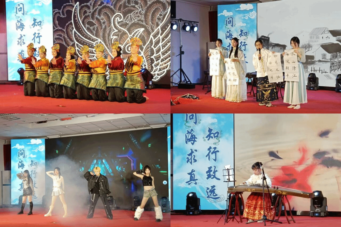 第三篇章“问海求真 波澜壮阔谱华章”,百花齐放春光无限好,兼容并包展现新生活。印尼舞蹈《ratoeh jaroe》让师生感受到了印尼艺术元素带来的异域风情;古筝弹奏、舞蹈表演《烟雨行舟》带来了一场国潮极致艺术享受;舞蹈《怪火》展示舞蹈者的热情澎湃;古筝弹奏《年轮》古典韵律与流行劲曲相得益彰,交相辉映。