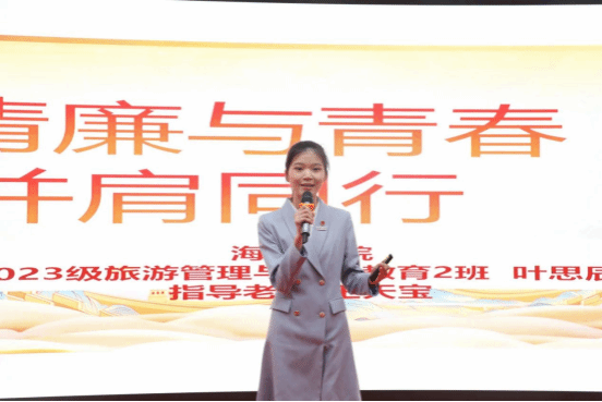 4月24日下午,由校党委宣传部、校团委联合举办的“青春建功·廉洁有我”大学生廉洁文化主题演讲比赛在五马山校区科学楼金泰学术报告厅举行。我院学生在决赛中取得佳绩,2023级旅游管理与服务教育(专升本)周宾艳荣获二等奖,2023级旅游管理与服务教育2班叶思辰荣获三等奖。