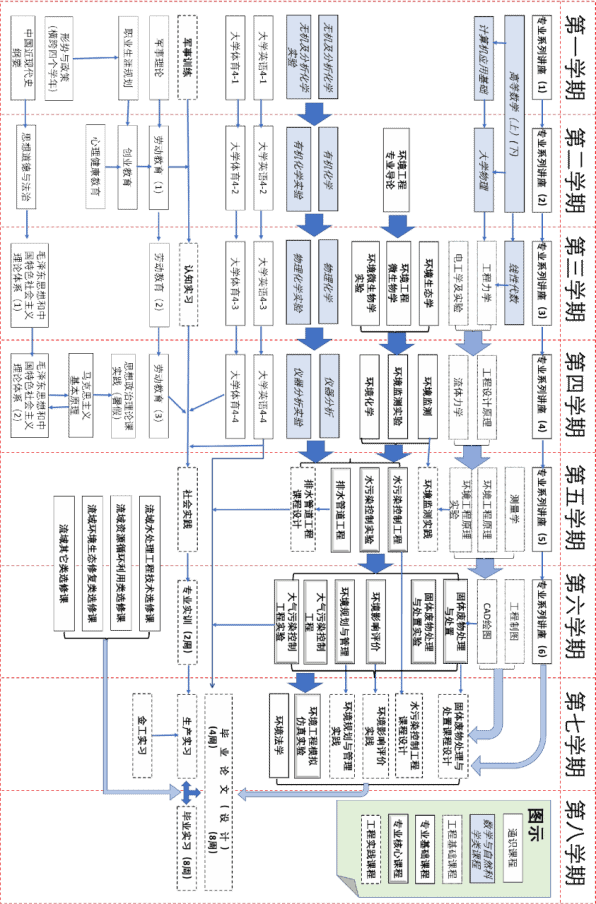 5.主要集中实践课程:社会实践、认知实习、金工实习、环境影响评价实践、水污染控制工程课程设计、排水管道工程课程设计、固体废物处理与处置课程设计、环境监测实践、环境规划与管理实践、生产实习、专业实训、毕业实习、毕业论文(设计)、劳动教育、军事训练。
