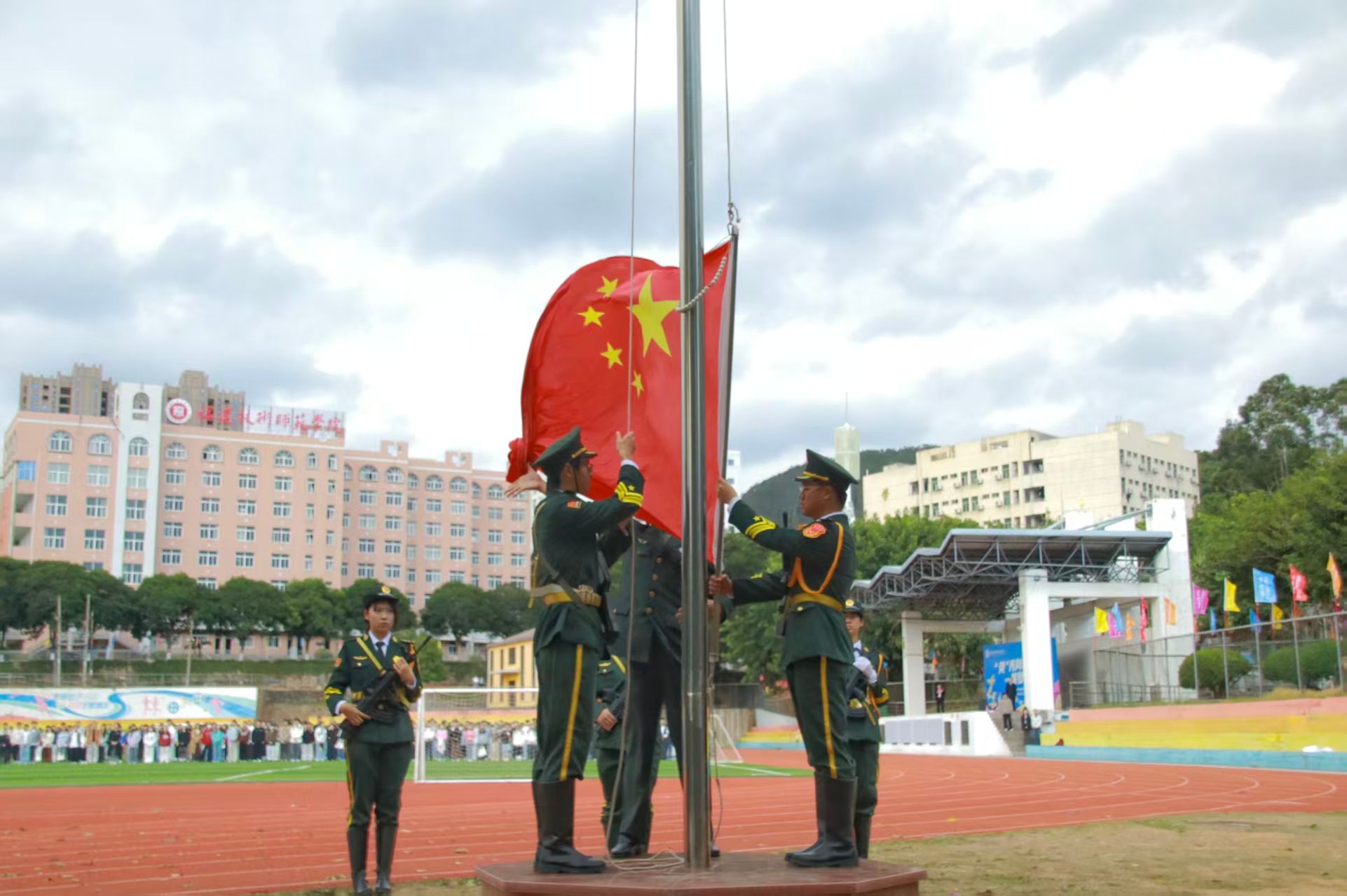 国旗护卫队迈着整齐有力的步伐护送国旗入场,在庄严的国歌中,五星红旗冉冉升起,迎风飘扬,全体师生行注目礼,齐唱国歌。